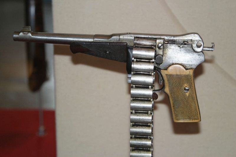 http://img.photobucket.com/albums/v4...1.jpg~original Treeby Chain Rifle of 1855. Since the things on the belt are chambers rather than rounds, this is actually a belt-fed revolver. The big handle in front of the chambers was a screw thread for sealing the gap between the front of the chamber and the barrel, you had to turn it down to form a seal before the weapon would actually fire. There were also handguns of this type. 1866 Josselyn 20-round chain revolver: http://img.photobucket.com/albums/v4...h.jpg~original And this thing. Nobody's that sure what it is, but it's in Tula's small arms museum labelled as a prototype from the 1920s. http://img.photobucket.com/albums/v4...6.jpg~original |
